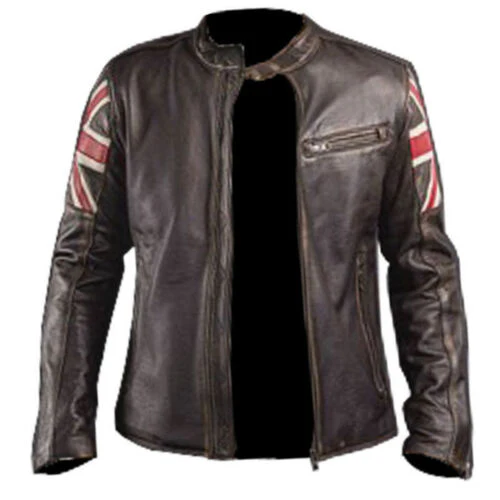 Mens Vintage UK Flag Distressed Brown Crossbones Skull Biker Leather Jacket