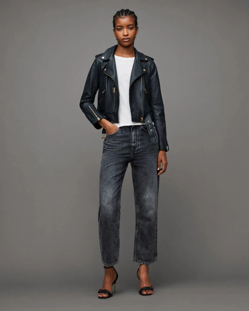 The Balfern Belted Hem Leather Biker Jacket combines classic biker style with a contemporary, feminine twist. Featuring premium leather, unique design elements, and functional details, this jacket offers both comfort and edge. Here’s a detailed breakdown of its features: