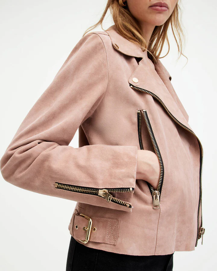• Functional Pockets: Equipped with zippered pockets on the chest and waist, the Beale Suede Biker Jacket offers practical storage for small essentials like keys, phone, or wallet. These pockets maintain the jacket’s sleek appearance while ensuring functionality.