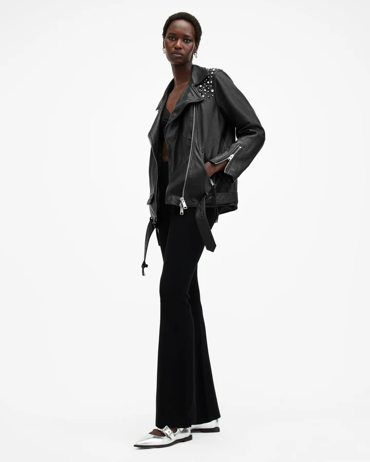 - Versatile Styling: The Billie Embellished Leather Biker Jacket is highly versatile, easily transitioning from day to night. Whether worn with jeans and a t-shirt for a more casual look or paired with a dress or skirt for a night out, the jacket elevates any outfit with its bold style and embellishment.