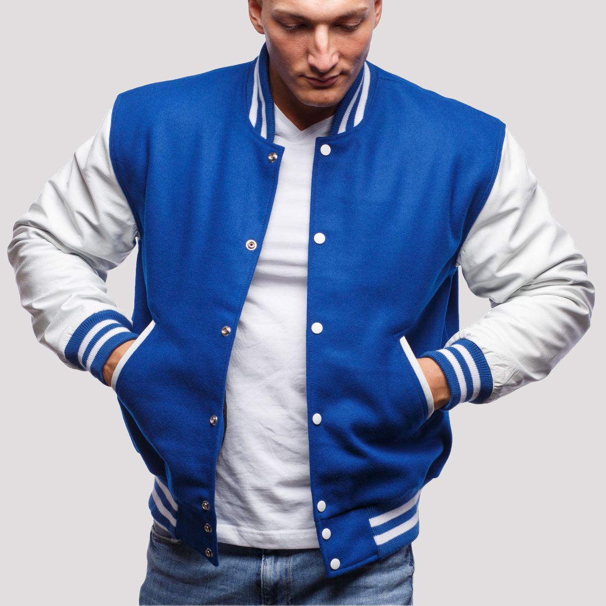 Blue Wool & White Genuine Leather Varsity Letterman Jacket