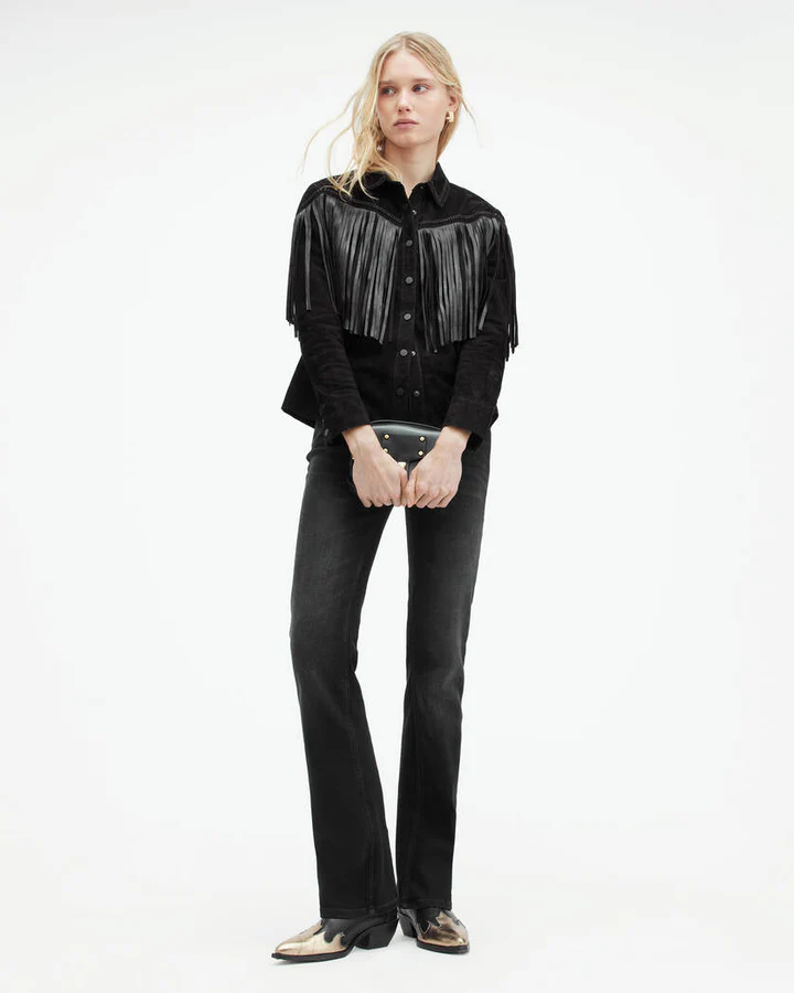 We’re into tassels, by the way. The Cleo Jacket keeps the western vibes going. Crafted from chrome free goat suede to a classic shirt shape with popper closure. The tassels go across the chest and on the back you’ll find a contrasting applique pattern created with leather in chevron shaped stitch work. Complete with matte black hardware for a coordinated finish – it’s the perfect top layer over knitwear and oversized tees.