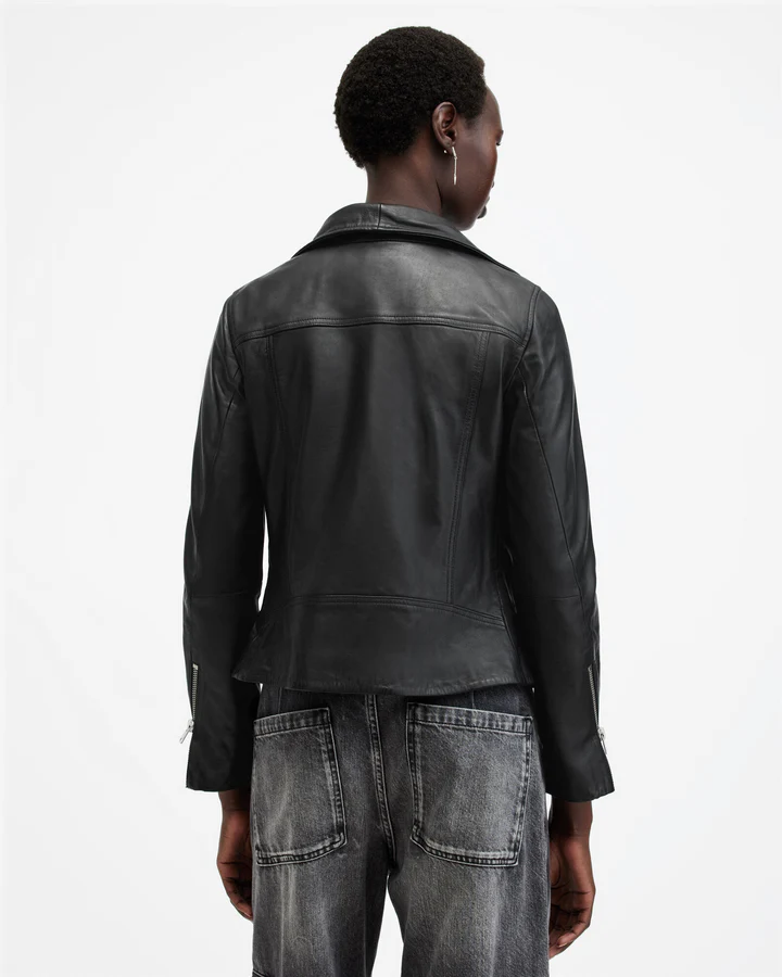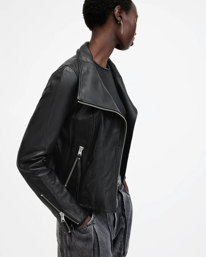 Crafted from luxurious, high-quality leather, the Ellis Leather Funnel Neck Biker Jacket offers a sleek and smooth finish.