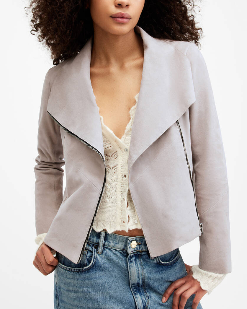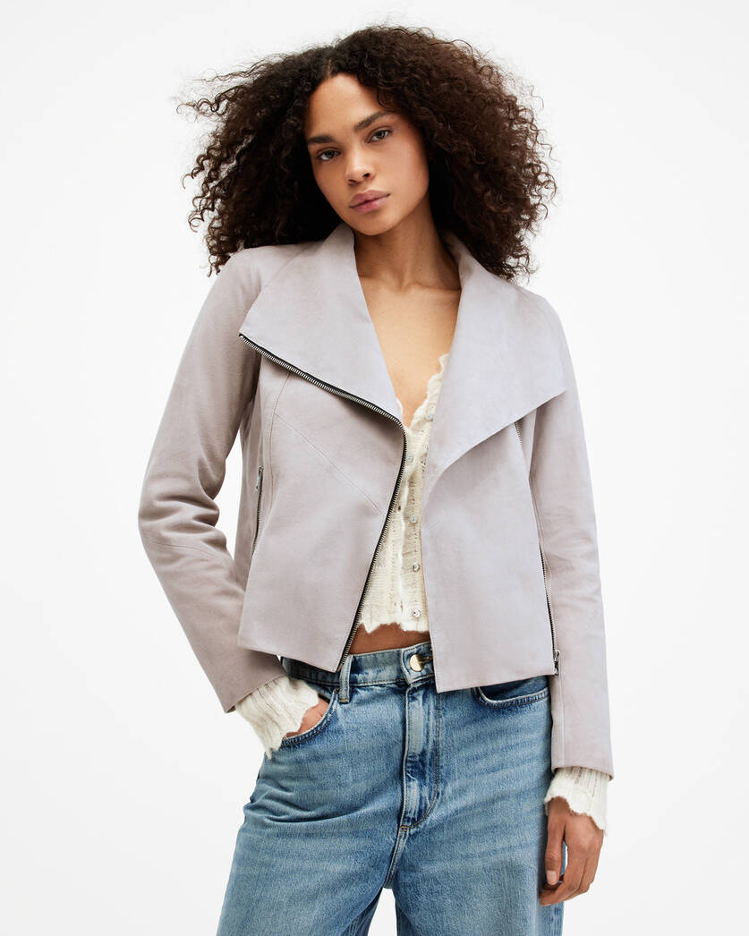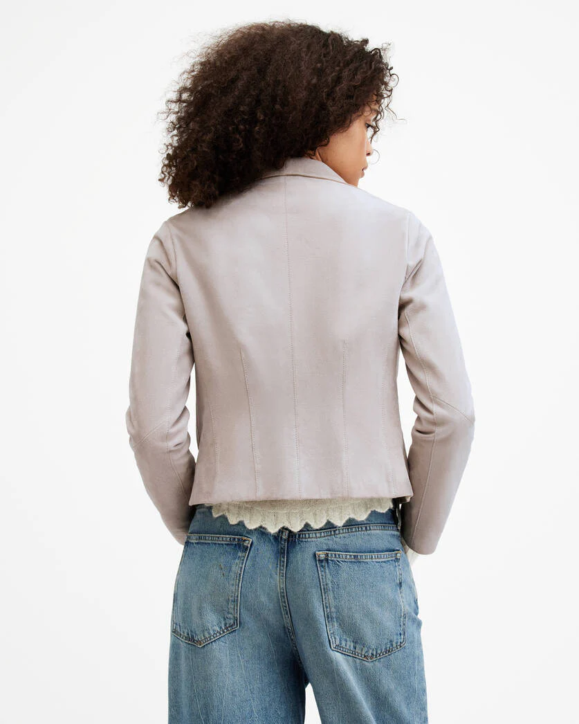 Our classic biker silhouette with an elegant overhaul. The Gray is a go-to option during that in between weather. Crafted from soft suede that’s softly draped with raw edge detailing and a funnel neck. This lightweight jacket has a sophisticated shape that looks beautiful placed over statement knitwear and simple tee.