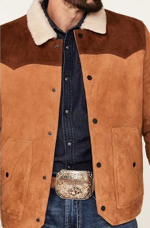 Introducing the epitome of rugged elegance: the John Dutton Yellowstone Jacket for Men. Crafted with meticulous attention to detail, this timeless piece is inspired by the iconic style of the legendary John Dutton from the hit series. Constructed from premium quality brown suede leather, this Men’s jacket exudes a rich, sophisticated aura while maintaining a rugged charm. The soft suede exterior is both durable and luxurious, ensuring lasting comfort and style. Designed in a classic trucker silhouette, this jacket boasts a versatile aesthetic that effortlessly transitions from casual outings to more formal occasions. The timeless appeal of its design is enhanced by meticulously crafted details, including button-front closure, chest pockets, and intricate stitching, reminiscent of the authentic Western craftsmanship.