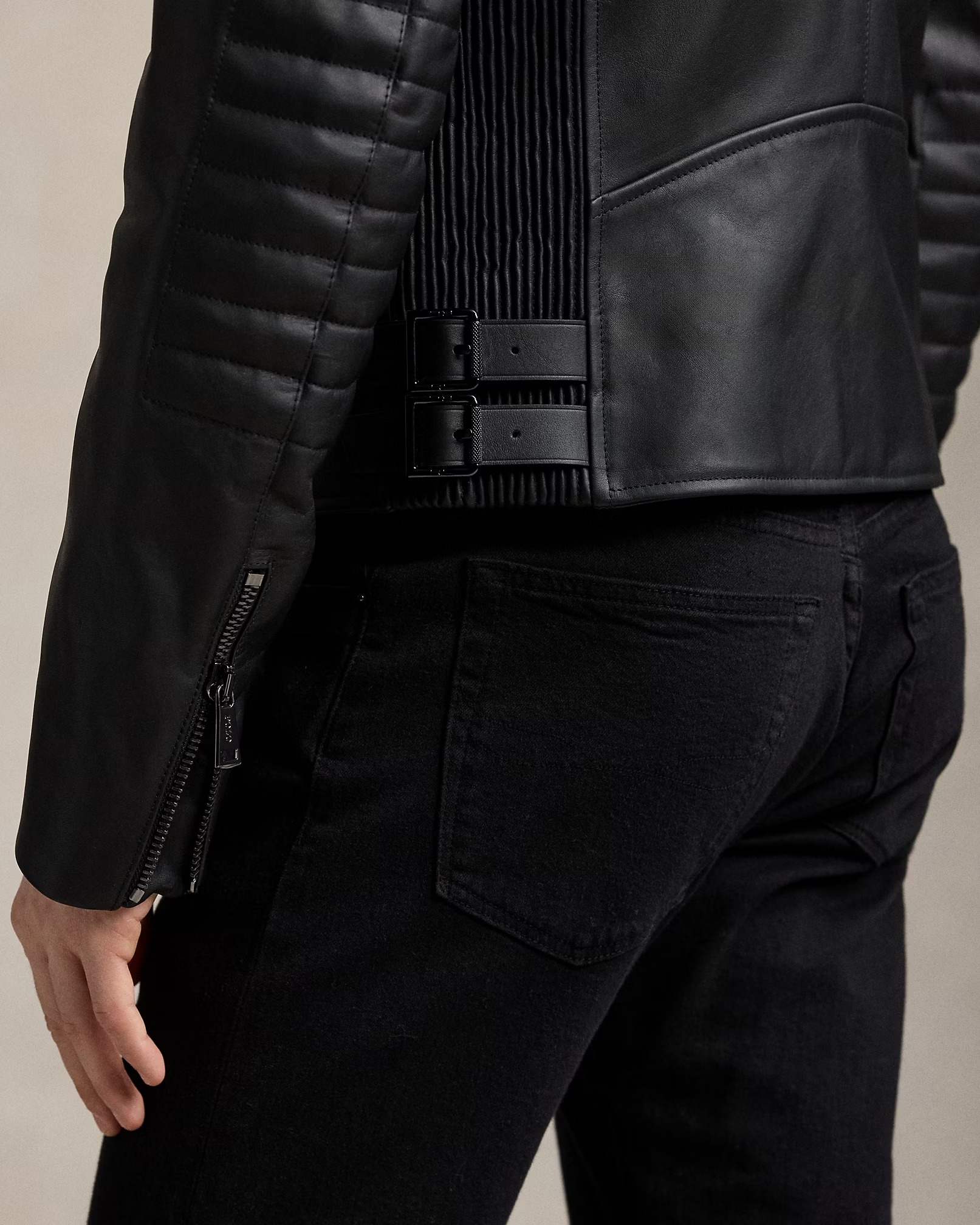 - Adjustable buckled tabs at the waist. Fully lined and filled.