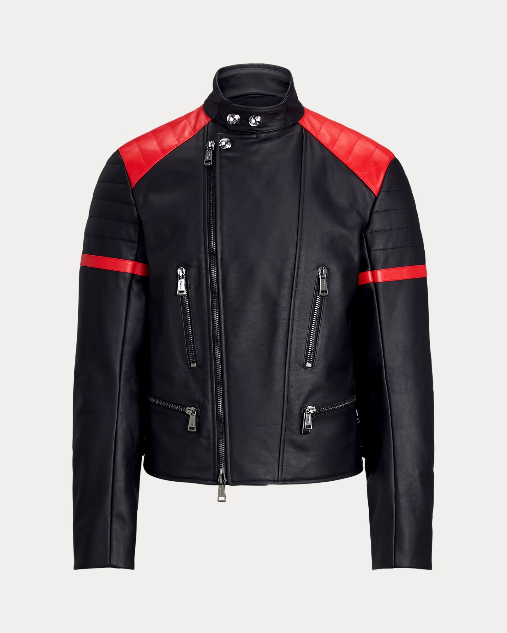 - Stand collar with two snaps on the front. Signature snaps. Asymmetrical two-way full-zip front.
