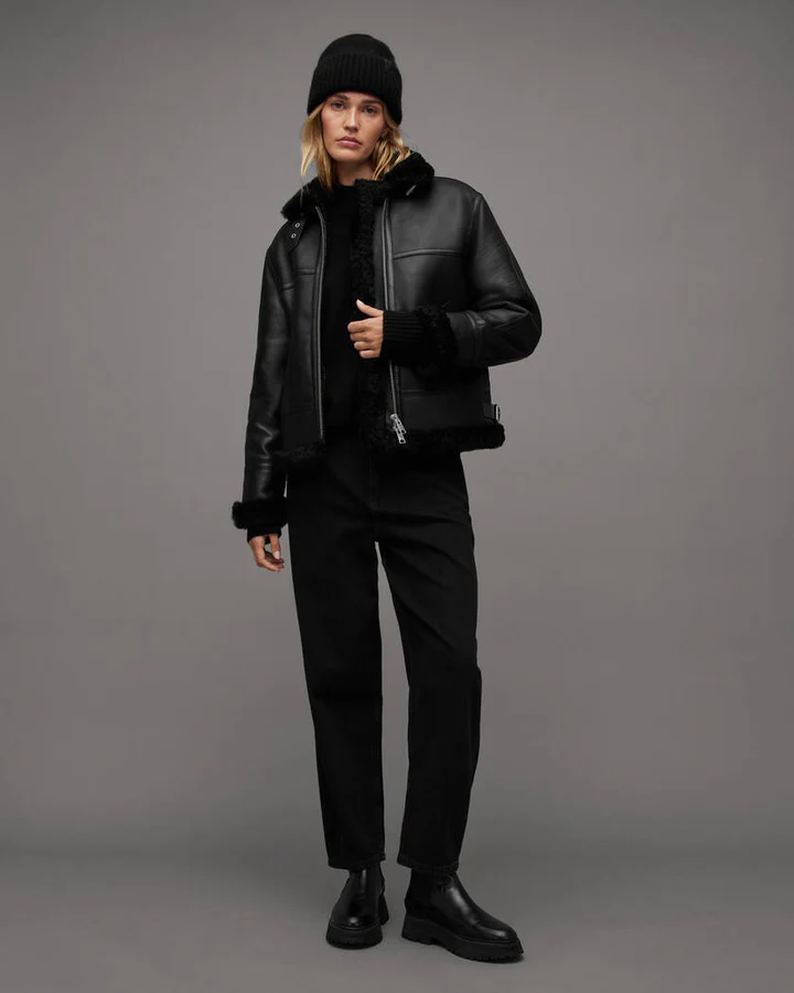 Keeping it traditional with the Lorel Flying Jacket. Constructed from shearling, it has a modern, relaxed silhouette. Curly wool trims paired with clean leather panelling – we love the contrast.