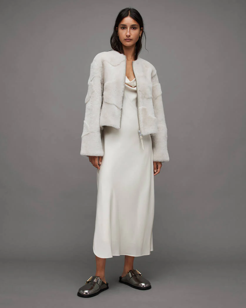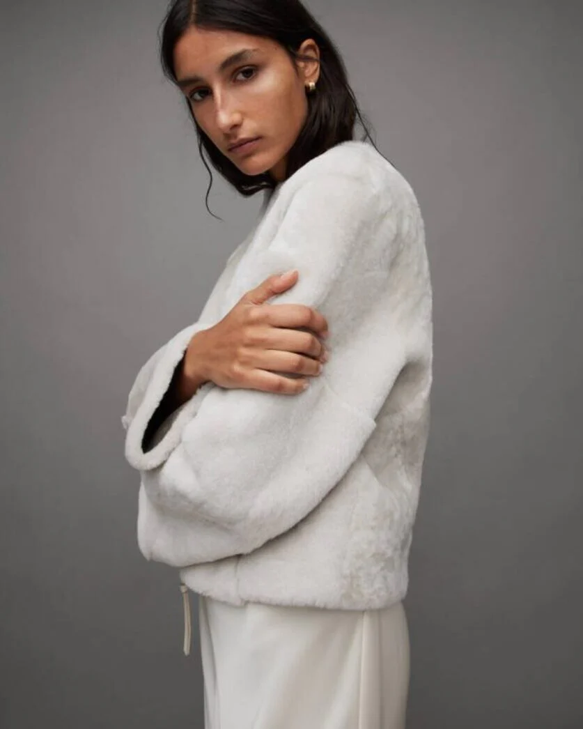 Premium Shearling Fabric: The Off-White Hania jacket is crafted from high-quality, plush shearling, providing an ultra-soft and luxurious feel. The shearling material offers superior warmth and comfort, making it an ideal choice for cold weather without compromising on style.