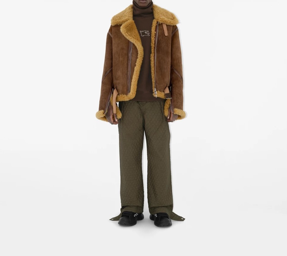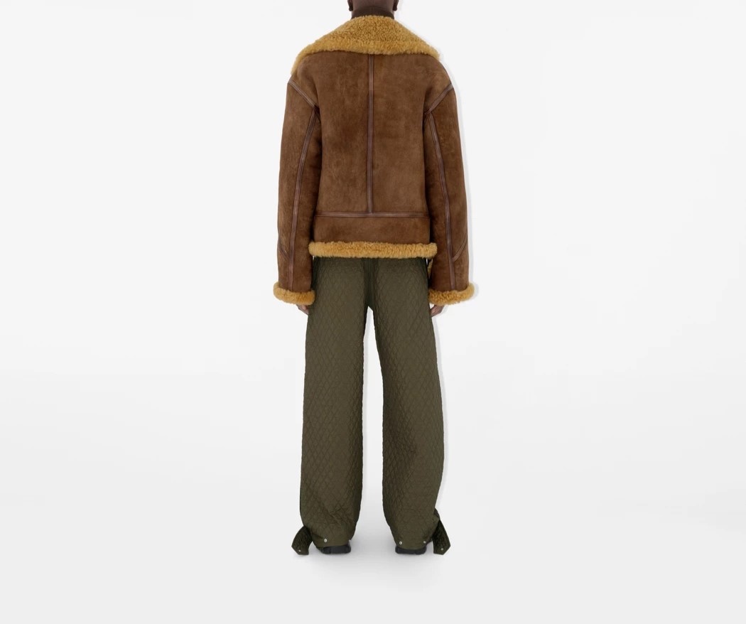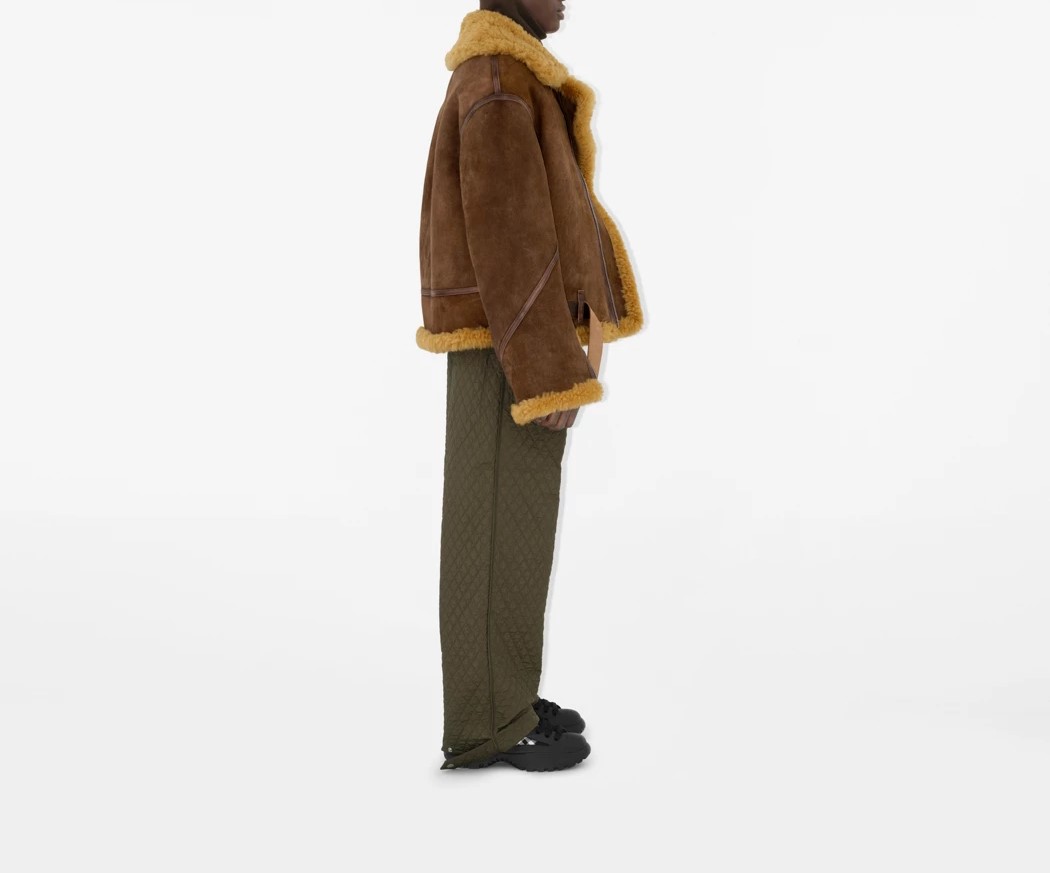 - An aviator jacket made in Pakistan from shearling with contrasting calf leather trims. The boxy style is detailed with B-cut zip pulls and a B buckle belt to adjust the silhouette. Cut to a relaxed fit for men and an oversized fit for women.