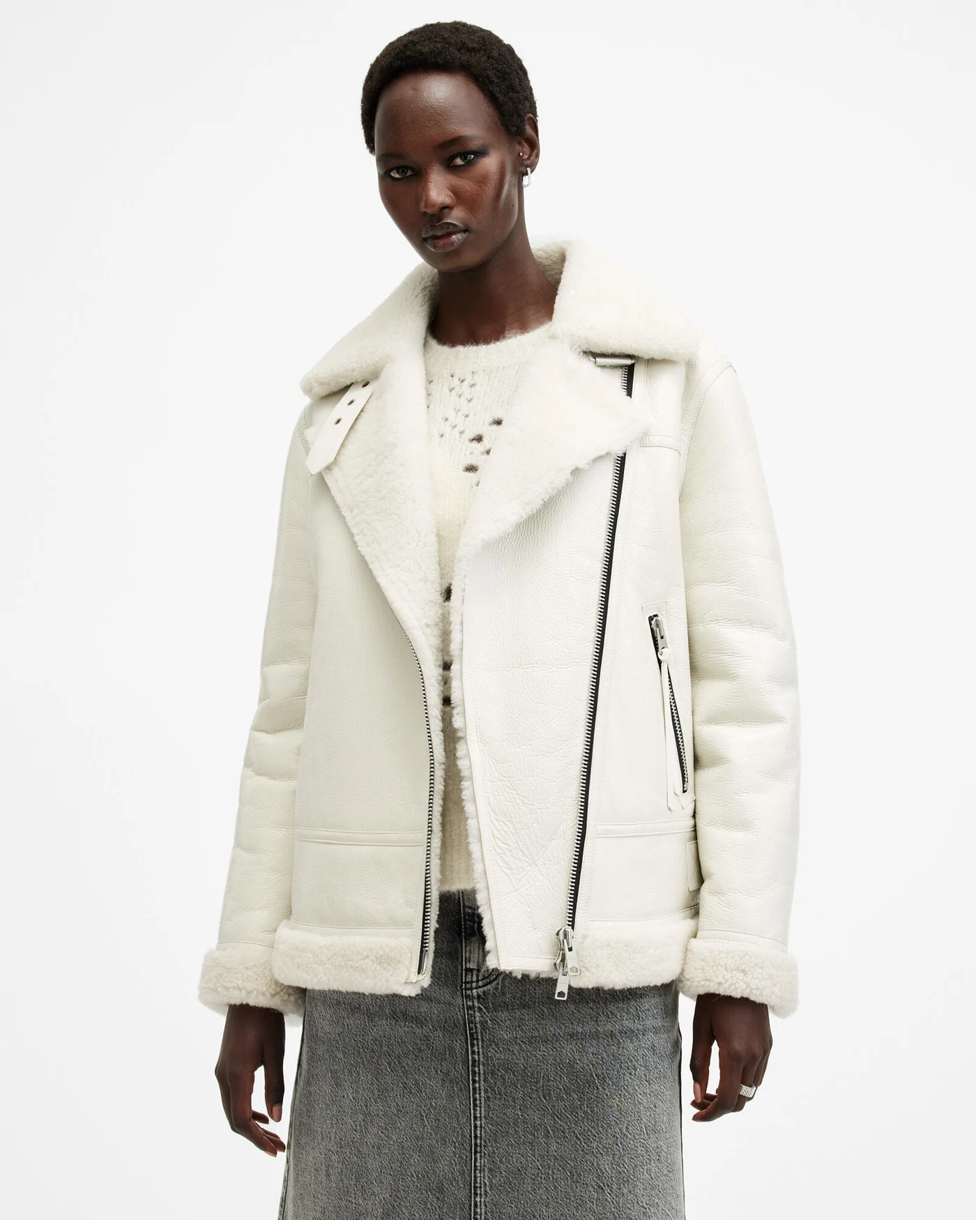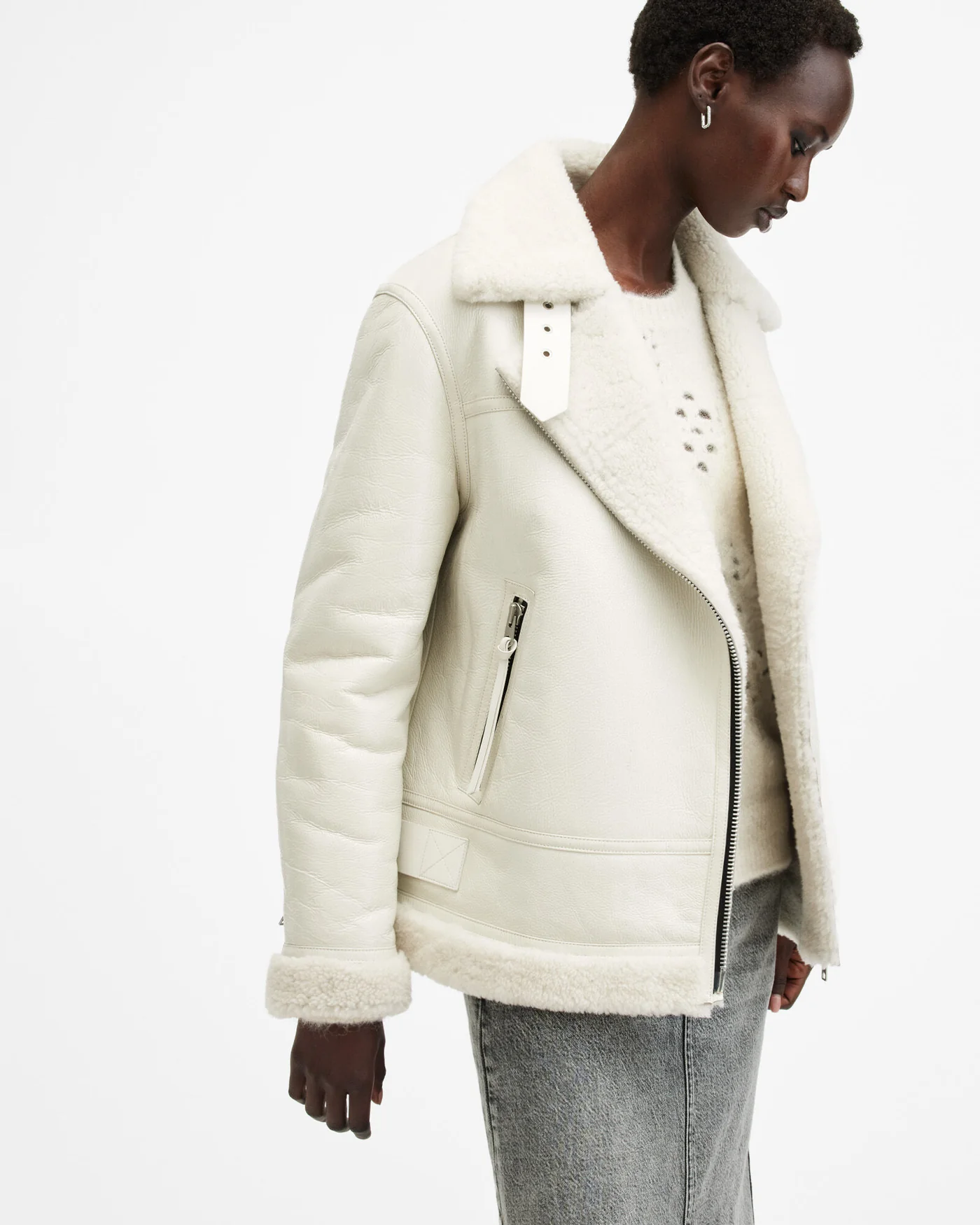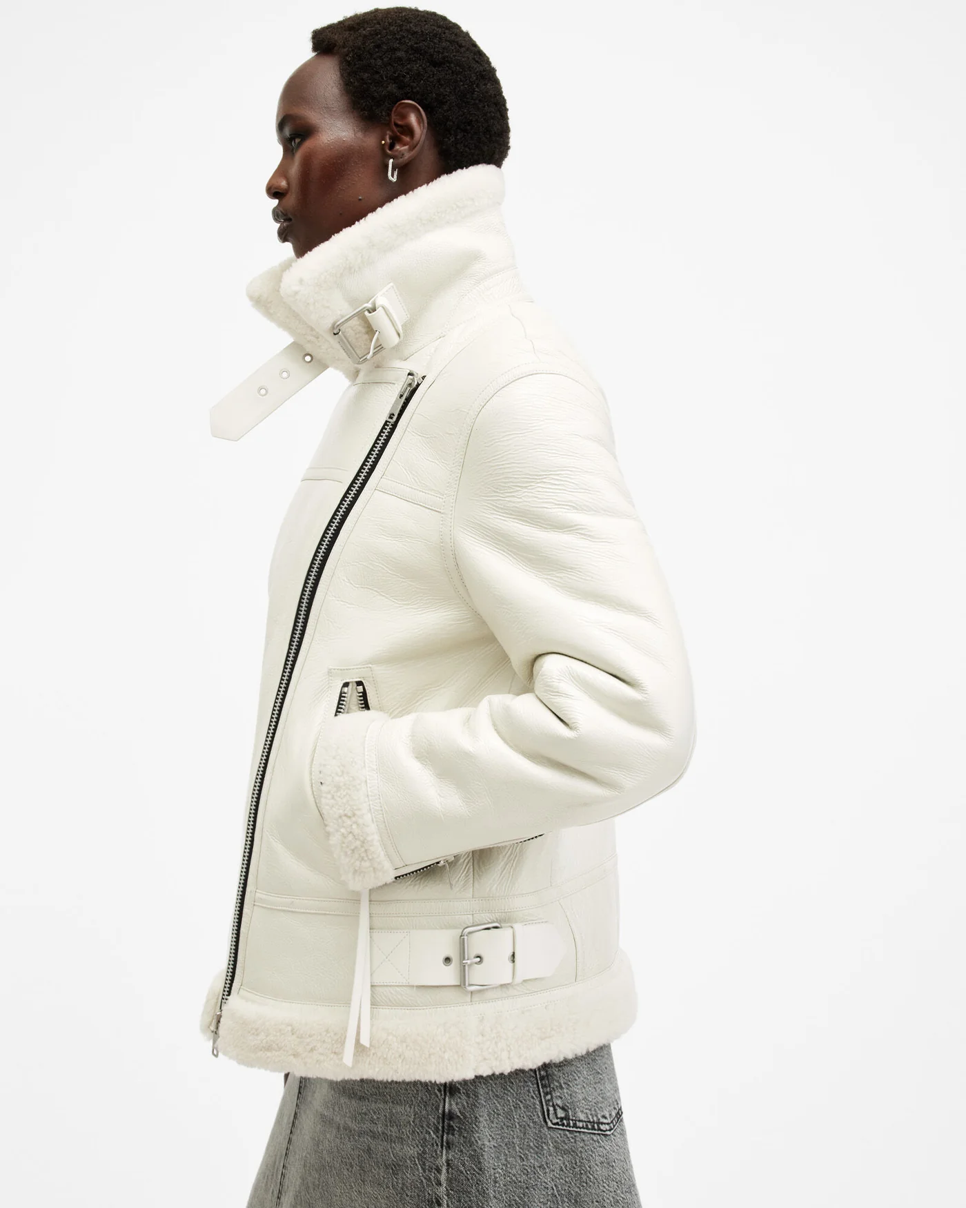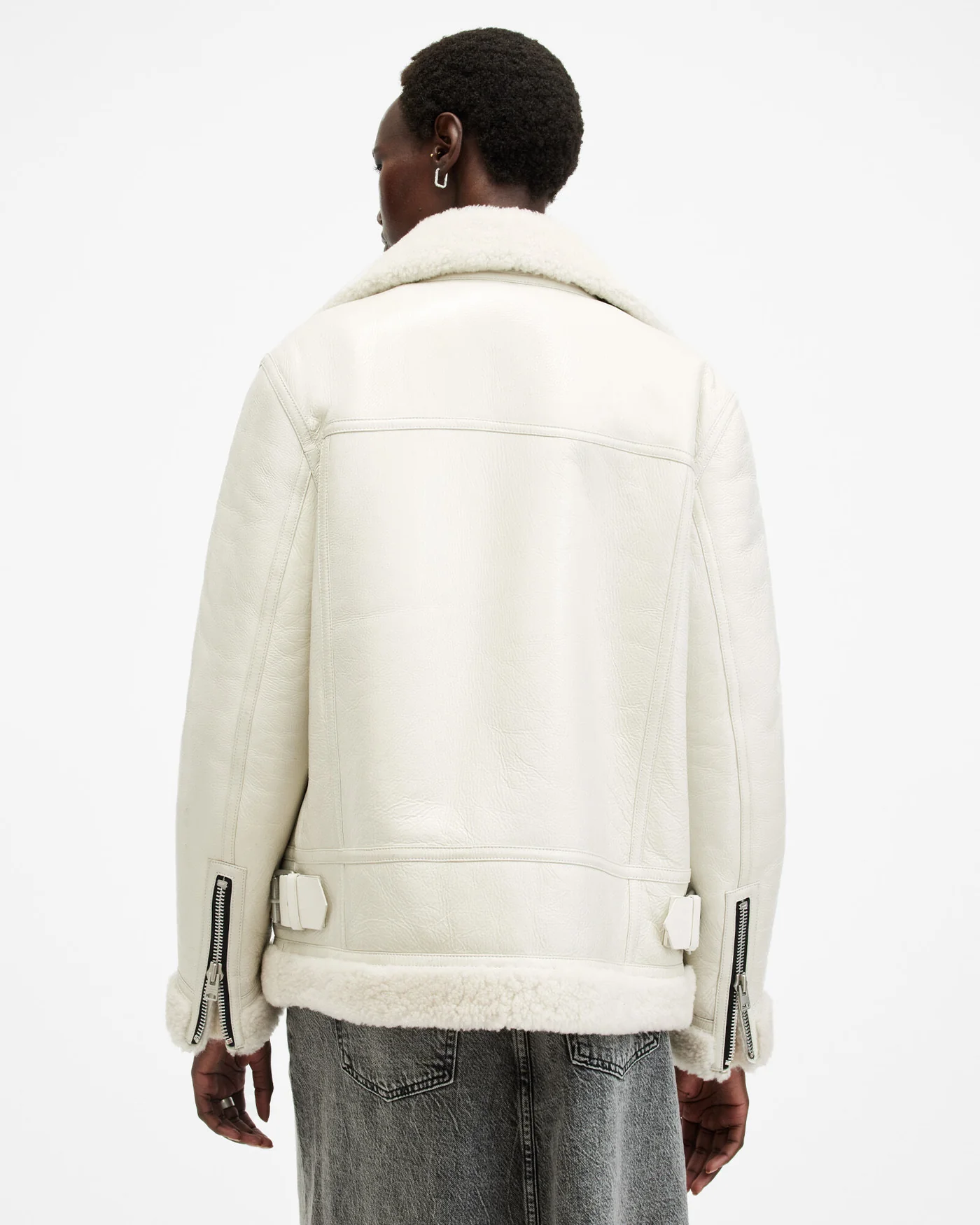 - Professional leather clean onlykey features:Premium Shearling Fabric: The jacket is made with high-quality shearling, which offers both warmth and softness. Shearling is known for its insulating properties, providing a cozy and luxurious feel, perfect for colder weather.