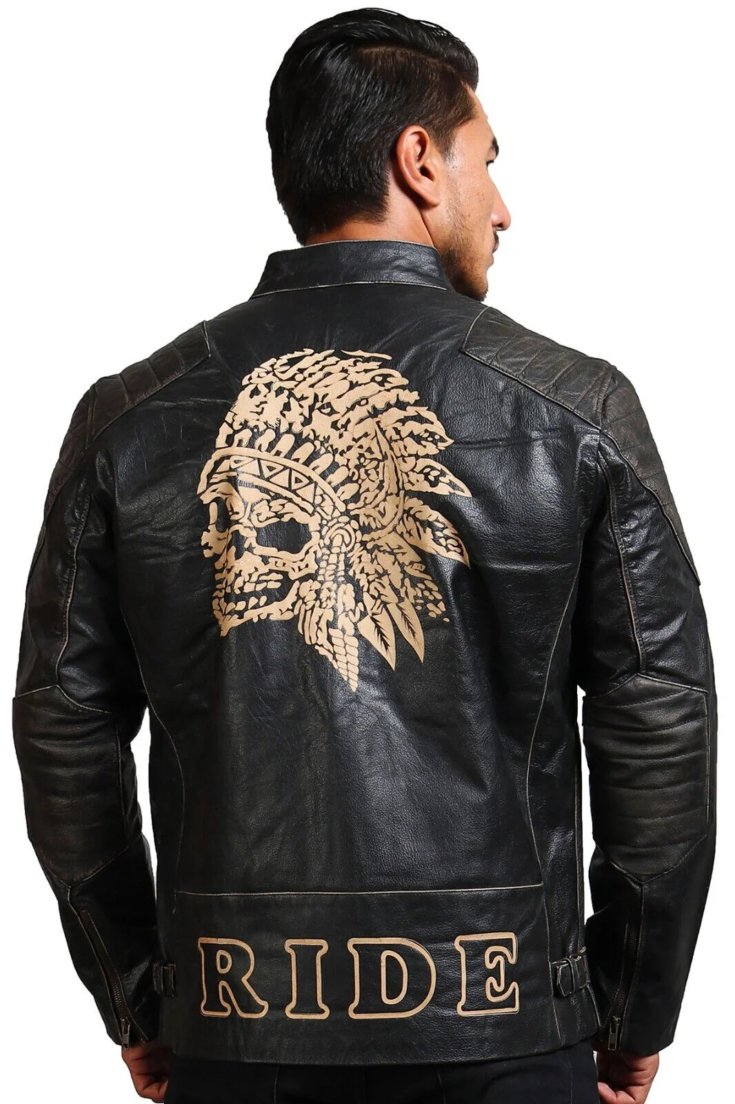 Amerind Mens Leather Jacket Cowhide Laser Engrave Indian Skull Motorcycle Jacket