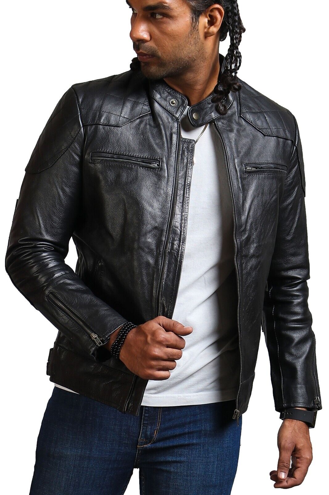 Apollo Leather Jacket Men Biker Stand Collar Snap Motorcycle Jacket Men